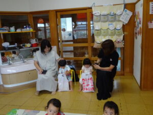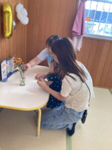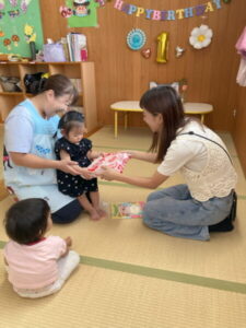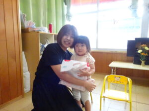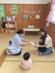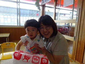 アルバム アルバム 8月・9月お誕生日会(さくら・もも組) 2025年10月2日 さくら組のお誕生日会です。さくら組さんは、2名のお友だちがお祝いをしてもらいました。お母さんと一緒に、とてもいい笑顔ですね! もも組さんは、7月に入園したお友だちのお誕生会でした。お母さんと一緒に記念写真を撮ってもらいました。ちょっと緊張しているかな?