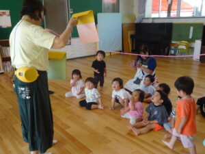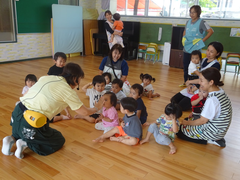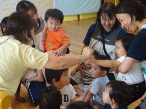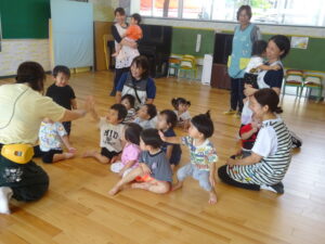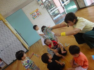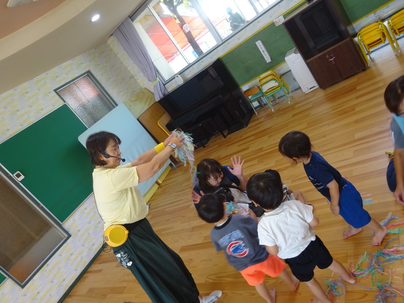 高附けいこ先生が、幼稚園にあそびに来てくださいました。0.1歳クラスのお友だちは、スズランテープのポンポンを使って、シャワーあそびをしたり、曲に合わせてお散歩ごっこをしたりして楽しく過ごしました。