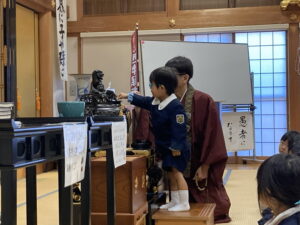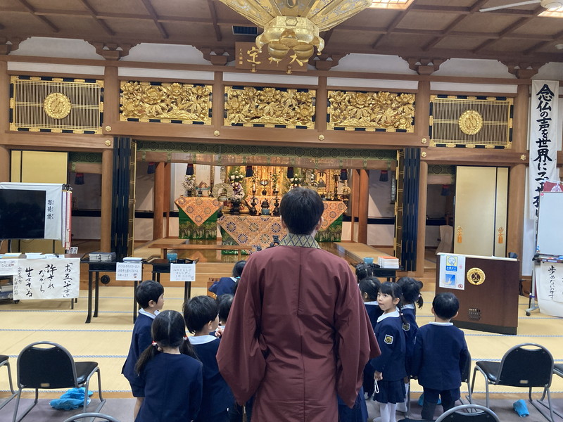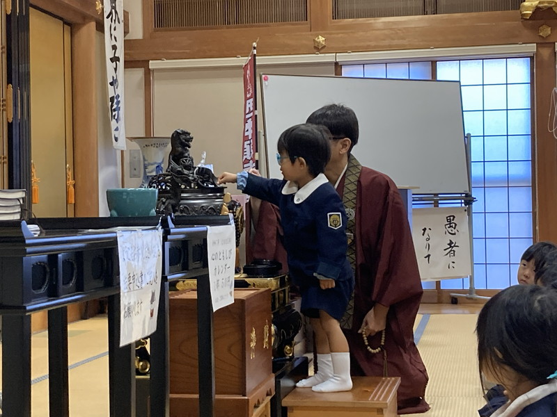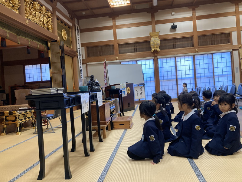 アルバム アルバム ご命日参拝☆彡(こあら組) 2026年1月7日 12月15日(月)は、12月のご命日参拝で和岡出張所にこあら組が参拝にでかけました。 3回目の本堂参拝で、子どもたちも落ち着いて参拝することができました。 今回も、畳に座って幼稚園と同じように正座でお参りを行いました。 お寺の先生がみ仏様についてお話をしてくださいました。 キラキラとしたみ仏様のお姿に、子どもたちの目もキラキラとかがやいていました。