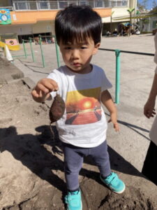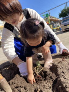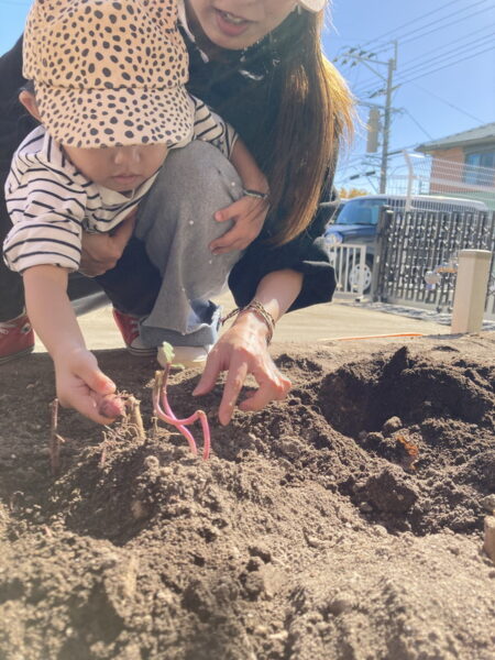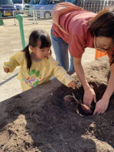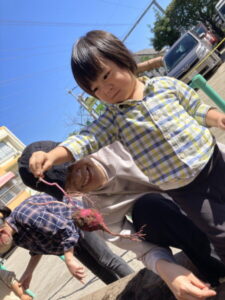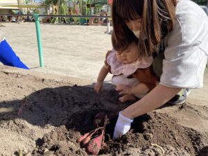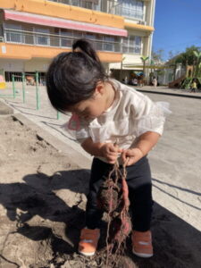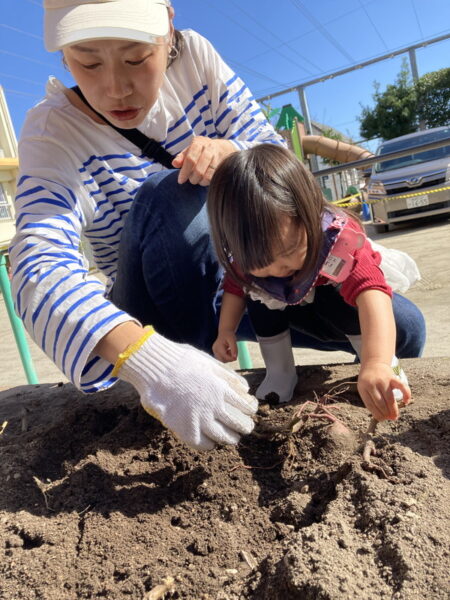 アルバム みのりちゃんクラブ・ベビークラブ 11月みのりちゃんくらぶ☆彡芋ほり 2026年1月7日 11月6日(木)にみのりちゃんクラブを行いました☆ 今回は、園庭菜園のお芋の収穫をしよう♪でした。 5月に植えたお芋の苗がすくすくと育ってくれ、たくさんの収穫を体験することができました♪ また、大きなカブのペープサートを見たり、園庭遊具や三輪車などで遊んだりと楽しい時間を過ごしてもらうことが出来ました☆